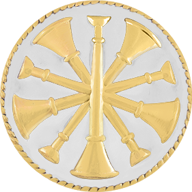 SW-C189WHE_G - Five Crossed Bugles $27.50 Five Crossed Bugles Insignia pin sold by the piece (NOT pair). Measures 15/16" in diameter. Comes with 2 pins on the back. Finish GoldRhodiumNickelCote D'Or Collar Brass Size 15/16" (largest)