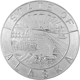 SW-AKP_N - State of Alaska $19.00 Custom Product - Delivery between 3-5 weeks. State of Alaska Seal measures 15/16" round (just under 1"). Available in Gold or Silver finishes. Sold as each (not sold in pairs). Finish NickelRhodiumGold Attachment Double Clutch Collar Brass Size 15/16" (largest)
