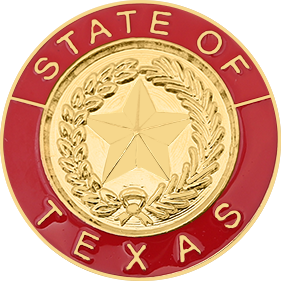SW-TXRE_G - State of Texas $27.50 Custom Product - Delivery between 3-5 weeks. State of Texas measures 15/16" round (just under 1"). Available in Gold or Silver finishes. Sold as each (not sold in pairs). Finish GoldNickelRhodium Attachment Double Clutch Collar Brass Size 15/16" (largest)