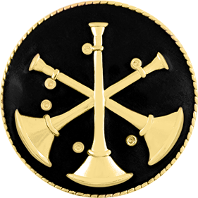 SW-C177BKE_G - Three Crossed Bugles $27.50 Three Crossed Bugles Seal Insignia pin sold by the piece (NOT pair). Measures 15/16" in diameter. Comes with 2 pins on the back. Finish GoldRhodiumNickel Attachment Double Clutch