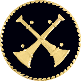 SW-C175BKE_G - Two Crossed Bugles $27.50 Two Crossed Bugles Insignia pin sold by the piece (NOT pair). Measures 15/16" in diameter. Comes with 2 pins on the back. Finish GoldRhodiumNickel Attachment Double Clutch