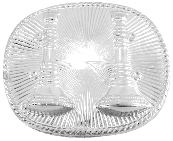 SW-C117_N_SP - Two Parallel Bugles Oval $32.00 Two bugles vertical insignia on an oval backing. Size: 1.625" high by 2" wide. Custom product - please allow 30 days for manufacture & delivery. Finish NickelGoldRhodium Attachment Screw Nut & PostDouble Clutch