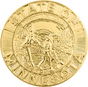 SW-MNP_G - State of Minnesota $24.00 Custom Product - Delivery between 3-5 weeks. State of Minnesota Seal measures 15/16" round (just under 1"). Available in Gold or Silver finishes. Sold as each (not sold in pairs). Finish GoldNickelRhodium Attachment Double Clutch Collar Brass Size 15/16" (largest)